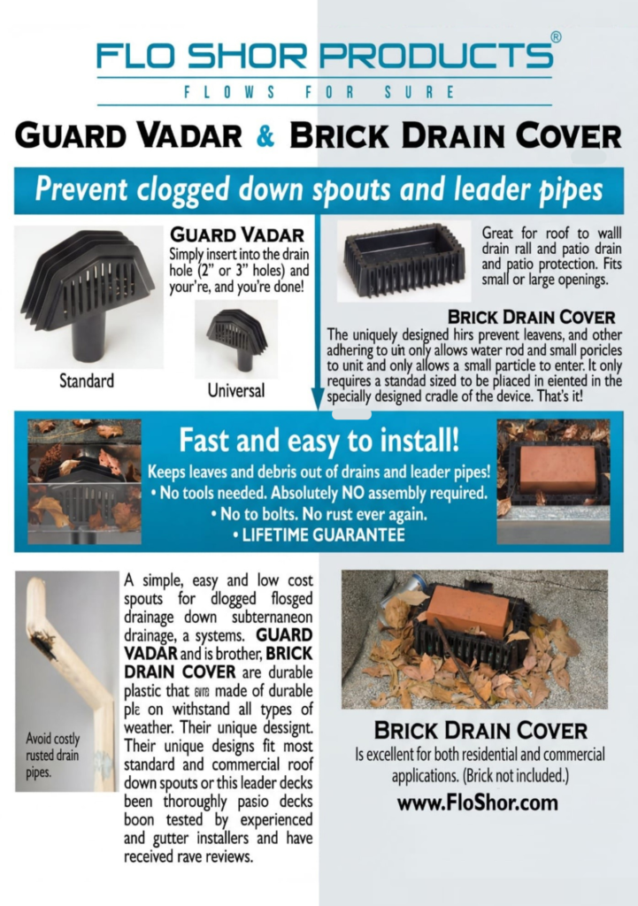 Guard Vadar and The Brick Drain Cover both have been designed for all gutter systems with round or square holes. Both products work in extremely well in high foliage areas. When It comes to durability, effectiveness, installation and cost.